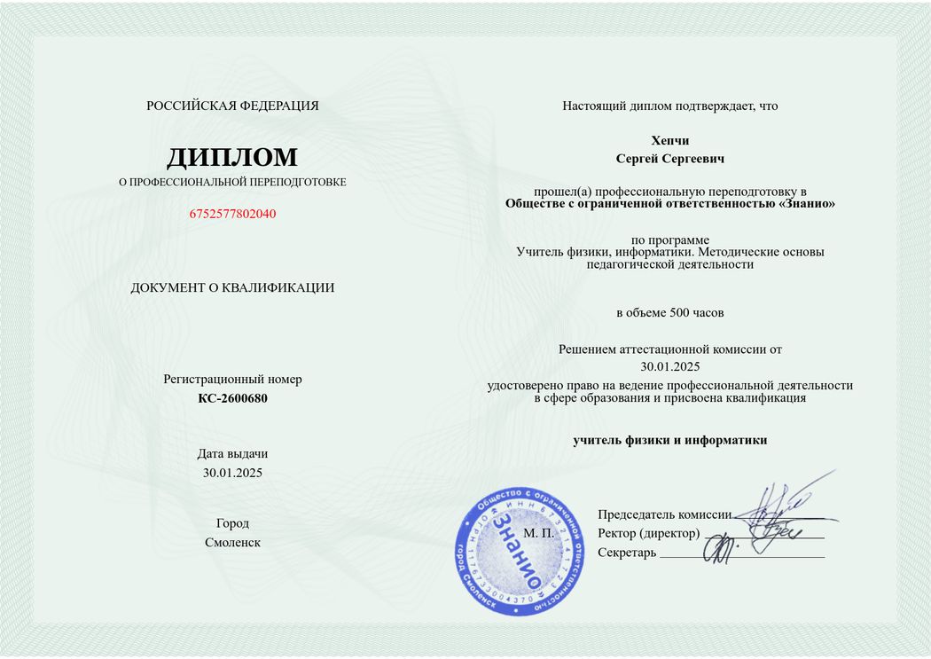 Диплом о профессиональной переподготовке 6752577802040, регистрационный номер КС-2600680,