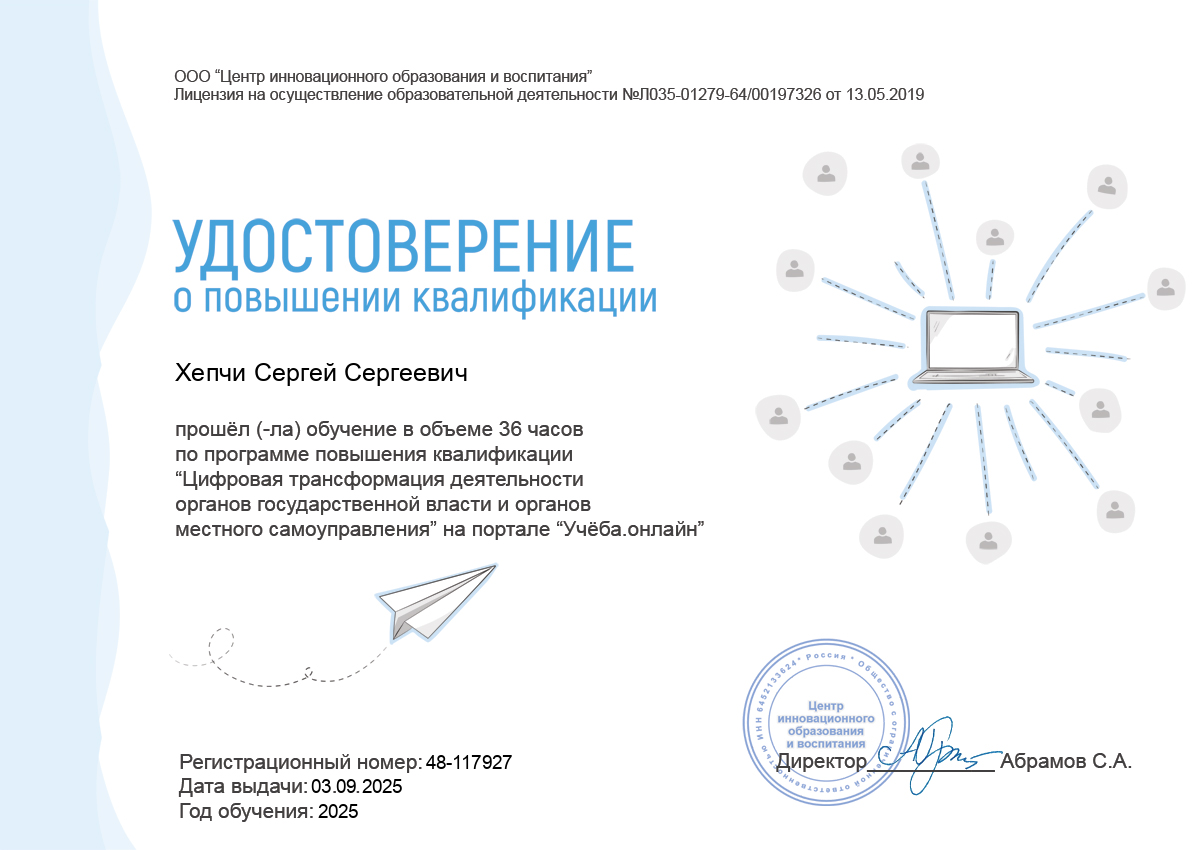 - обучение по программе повышения квалификации «Цифровая трансформация деятельности органов государственной власти и органов местного самоуправления», ООО "Центр инновационного образования и воспитания", г. Саратов, 36ч, 2025г.