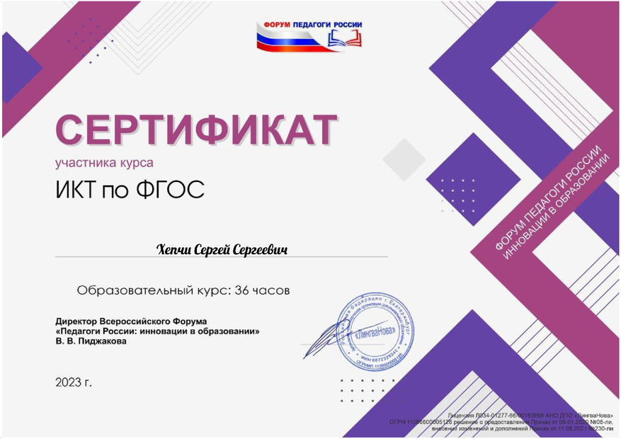 - "ИКТ по ФГОС", Сертификат участника курса, образовательный курс 36 часов. Всероссийский Форум "Педагоги России: инновации в образовании". Ноябрь 2023г.