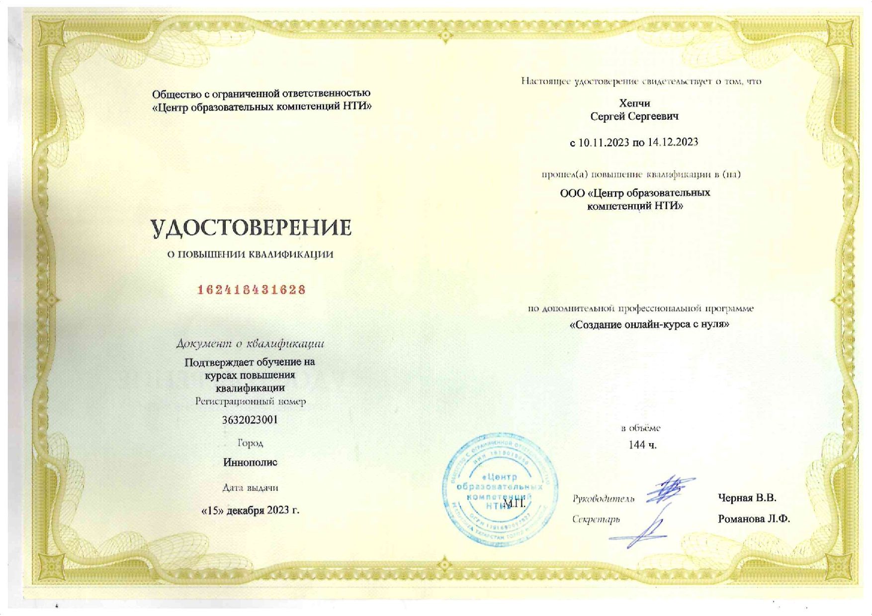 - "Создание онлайн-курса с нуля", ООО "Центр образовательных компетенций НТИ", г. Иннополис, 144 часов, ноябрь-декабрь 2023г., Удостоверение о повышении квалификации 162418431628, Регистрационный номер 3632023001, Дата выдачи 15.12.2023