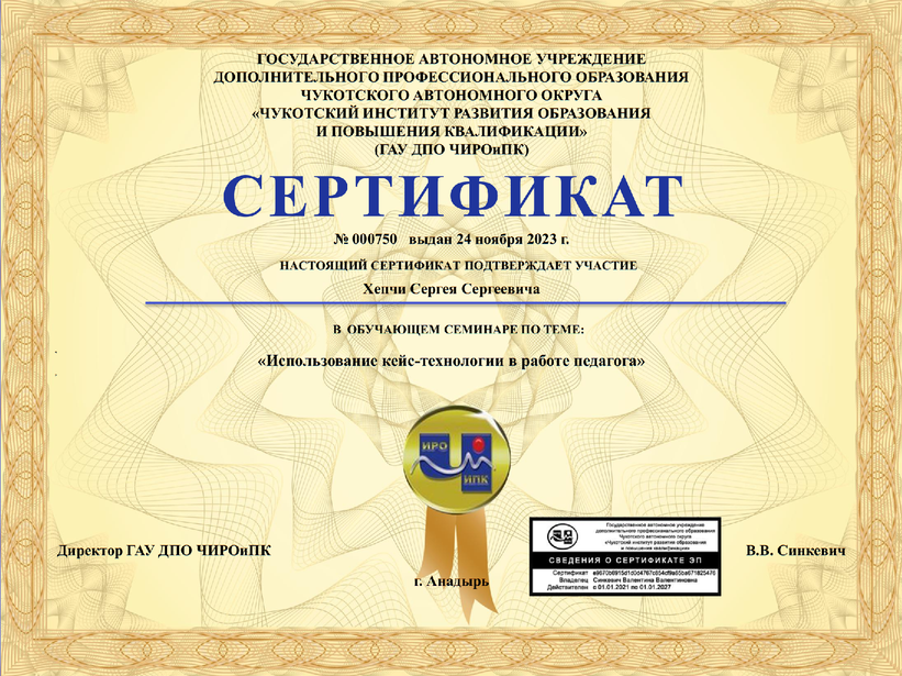 - "Использование кейс-технологии в работе педагога", Государственное автономное учреждение дополнительного профессионального образования Чукотского автономного округа "Чукотский институт развития образования и повышения квалификации", Сертификат участия № 000750 выдан 24.11.2023г.