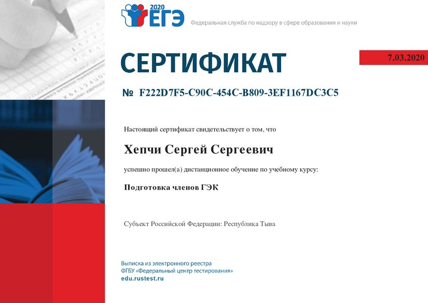 - прошёл дистанционное обучение по учебному курсу: "Подготовка членов ГЭК" в ФГБУ "Федеральный центр тестирования", сертификат № F222D7F5-C90C-454C-B809-3EF1167DC3C5 ОТ 07.03.2020Г.