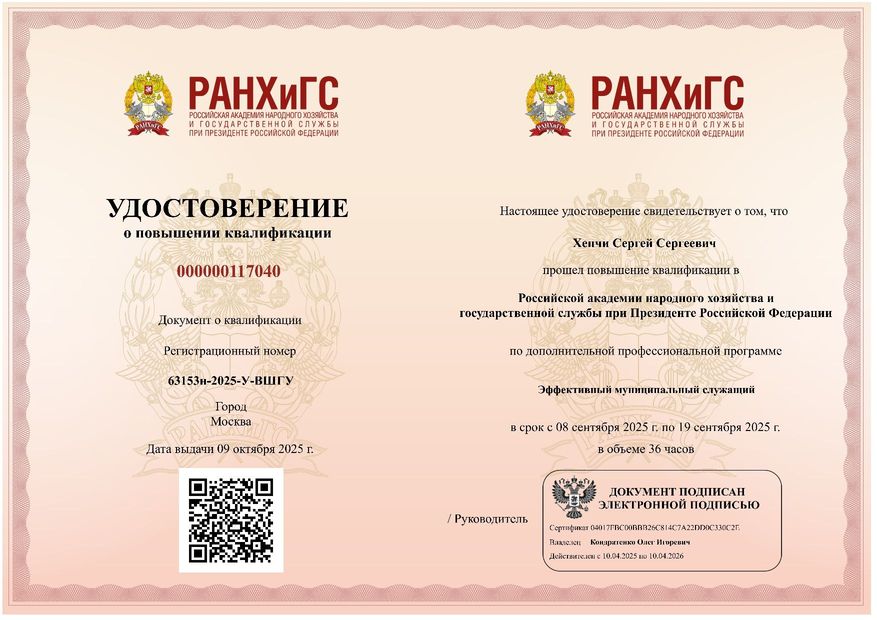 - обучение для муниципальных служащих "Эффективный муниципальный служащий", ВШГУ РАНХиГС, г.Москва, 36ч, 2025г.