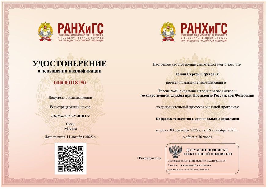 - обучение для муниципальных служащих "Цифровые технологии в муниципальном управлении", ВШГУ РАНХиГС, г.Москва, 36ч, 2025г.