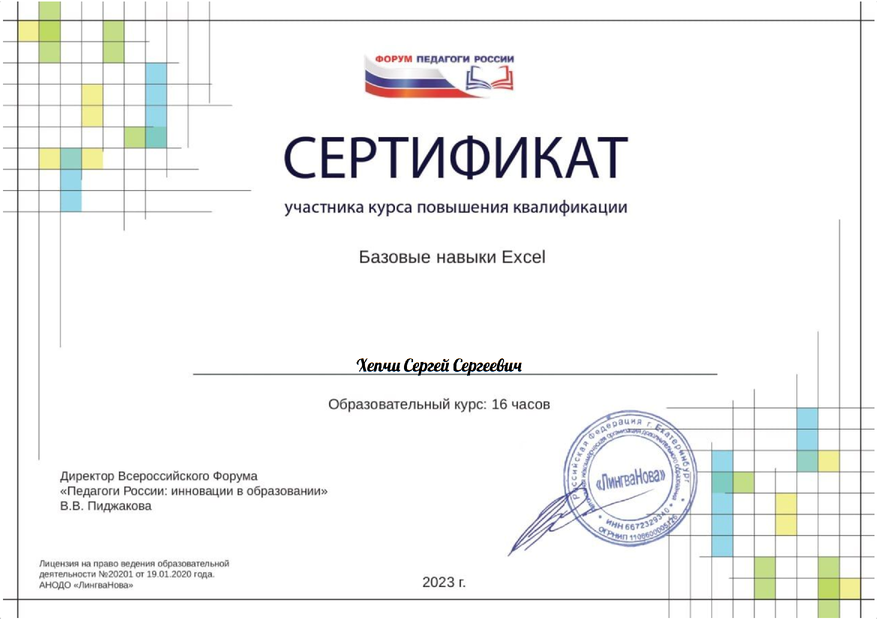 - "Базовые навыки Excel", Сертификат участника курса, образовательный курс 16 часов. Всероссийский Форум "Педагоги России: инновации в образовании". Ноябрь 2023г.