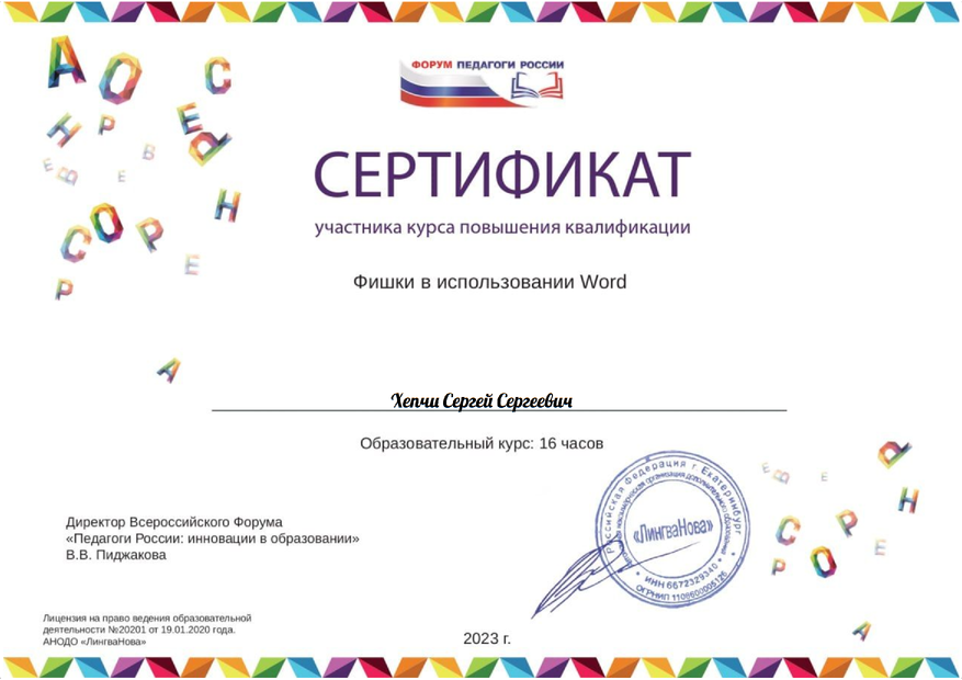 - "Фишки в использовании Word", Сертификат участника курса, образовательный курс 16 часов. Всероссийский Форум "Педагоги России: инновации в образовании". Ноябрь 2023г.