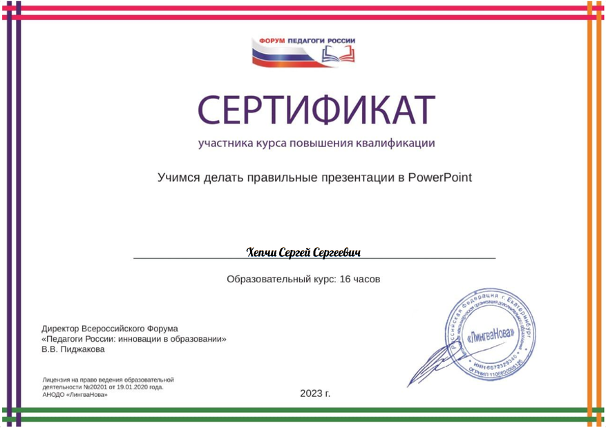 - "Учимся делать правильные презентации в PowerPoint", Сертификат участника курса, образовательный курс 16 часов. Всероссийский Форум "Педагоги России: инновации в образовании". Ноябрь 2023г.