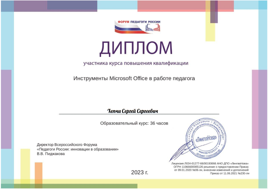 - "Инструменты Microsoft Office в работе педагога", Диплом участника курса повышения квалификации, образовательный курс 36 часов. Всероссийский Форум "Педагоги России: инновации в образовании". Ноябрь 2023г.
