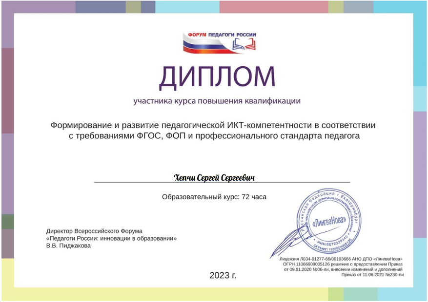 Учитель математики и информатики Хепчи Сергей Сергеевич прошел профессиональную переподготовку в Обществе с ограниченной ответственностью «Знанио» по программе “Учитель физики, информатики. Методические основы педагогической деятельности”, в объёме 500 часов. Решением аттестационной комиссии от 30.01.2025 удостоверено право на ведение профессиональной деятельности в сфере образования и присвоена квалификация Учитель физики и информатики. Диплом о профессиональной переподготовке 6752577802040, регистрационный номер КС-2600680, г. Смоленск.