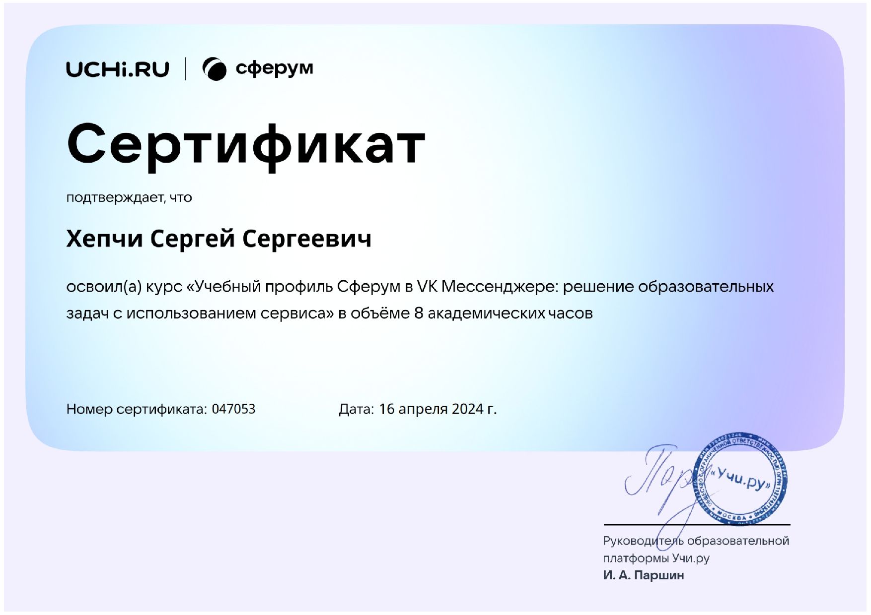 - "Учебный профиль Сферум в VK Мессенджере: решение образовательных задач с использованием сервиса", 8 ч., 16.04.2024г., UCHi.RU | Сферум, номер сертификата: 047053.